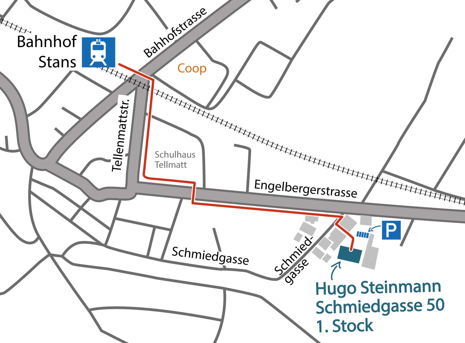 Die Praxis befindet sich mitten in Stans, 5 Minuten vom Bahnhof entfernt, in der Schmiedgasse 50.